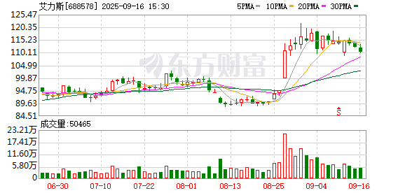 证券时报·数据宝统计显示,艾力斯今日收盘价为110.36元,下跌1.64%,日换手率为1.12%,成交额为5.60亿元,全天主力资金净流出9530.49万元,近5日该股累计下跌3.99%,近5日资金合计净流出3.27亿元。