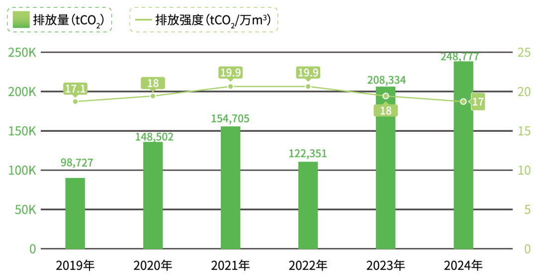 2024年,准东宜化项目碳排放量约24.87万吨。2019-2024年间,在工程量持续增长的情况下,实现了碳排放强度的稳步下降。
