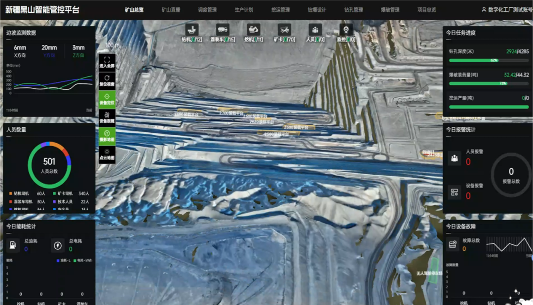 在民爆生产领域,打造以数字孪生为核心的智慧工厂,实现生产全流程智能监测与自动化作业;在矿山施工方面,构建“1+2+6+6”数智化管控体系,覆盖施工全环节与管理要素。