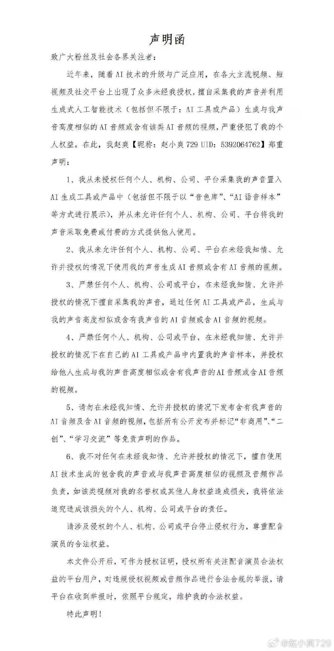 △多名配音演员相继公开发声,反对未经演员知情同意,擅自采集其声音素材用于AI训练、音色合成及商业变现的行为。
